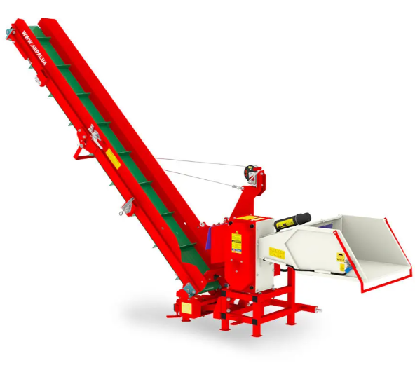 Broyeur bois AM-120TR-K PRO pour tracteur 24 CV. Coupe branches jusqu’à 120 mm, productivité 10 m³/h, convoyeur à bande pour bois fini.