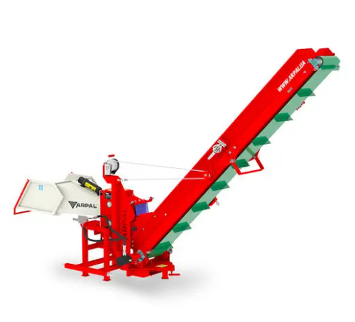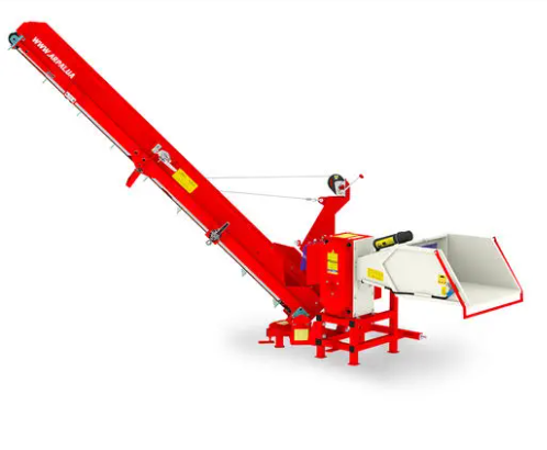 Broyeur de bois AM-120TR-K PRO à tracteur avec convoyeur à bande en fonctionnement